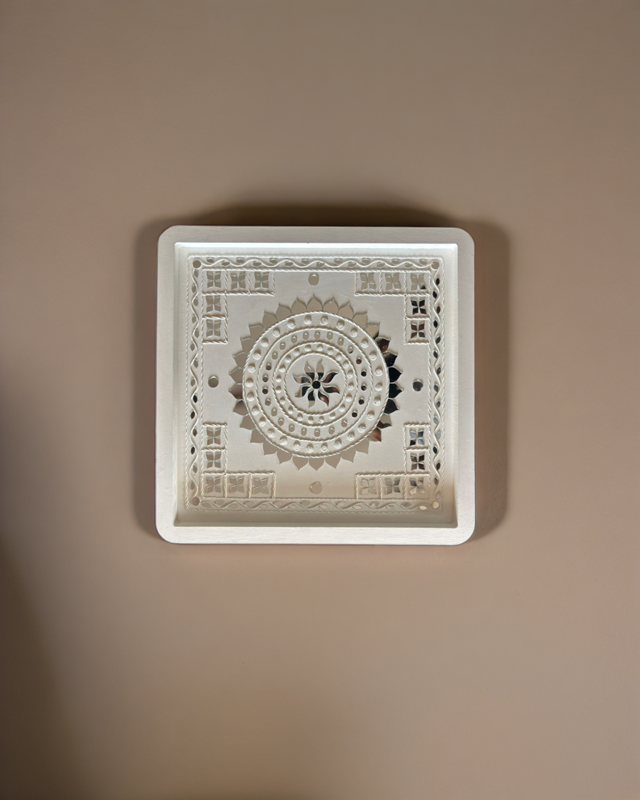 Step into the heart of Kutch’s mud art heritage with this Bhori Flower embroidery-inspired wall décor piece, a radiant example of mud art. This 13×13 inch handmade creation celebrates the mud art of Gujarat, blending design elements of Lippan art and embroidery with a box design aesthetic. At its center glows a circular mandala motif with floral details, framed by a rope border. Four tiny square mirrors at each corner catch the light, while raised detailing on the white MDF base enhances its charm. This square composition follows a classic box design that emphasizes symmetry and balance.